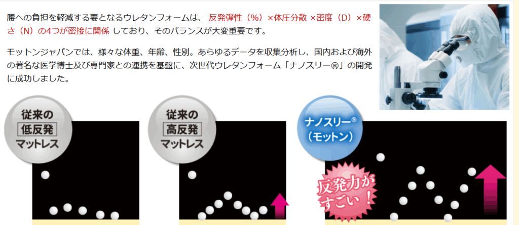 モットンマットレスがへたりにくい最大の理由は、その中材に使用されている「ナノスリー」と呼ばれる次世代高反発ウレタン素材にあります。