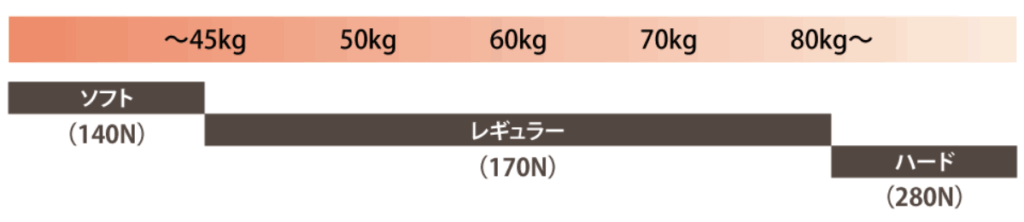 しかも、体重別に選べる3種類の硬さ(ソフト・レギュラー・ハード)が用意されており、自分の体に合った反発力を選択可能です。