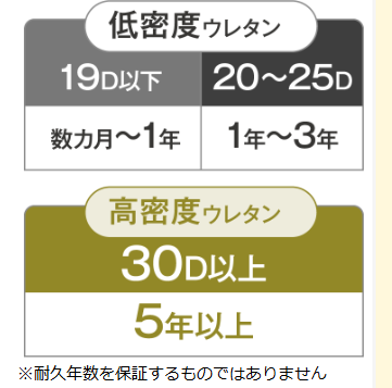 一般的な安価なウレタンマットレスは20D以下の密度であることが多く、使用数年で凹みやすくなる傾向があります。